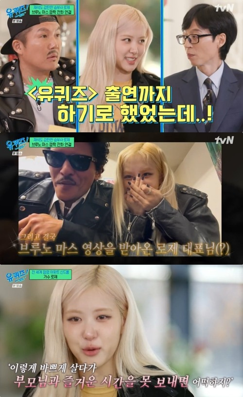 최근 로제가 tvN의 인기 예능 프로그램 '유 퀴즈 온 더 블럭'에 출연하면서 브루노 마스와의 특별한 인연을 공개했어요. 로제는 브루노 마스와 함께 출연하기로 했었다고 밝혔는데, 이 소식에 많은 팬들이 기대감을 드러냈죠. 로제는 "사실 브루노 마스도 같이 들어오기로 했다. 내가 '유퀴즈'에 함께 출연하자고 초대했고, 출연 승낙까지 받았다"라고 말했어요.