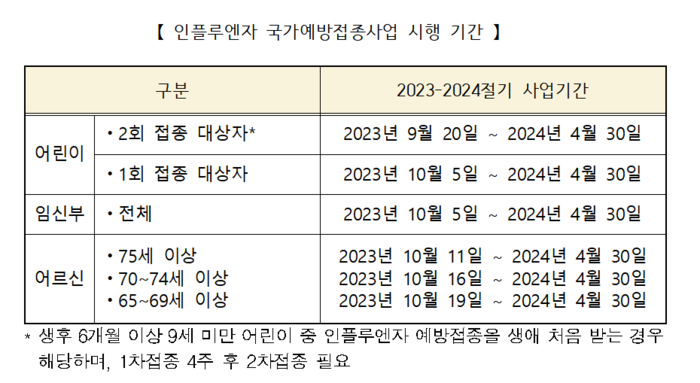 2023-2024절기 백신 접종 일정은 다음과 같아. 어린이와 임산부, 노인 등 다양한 대상군이 있어. 어린이는 9월 20일부터 두 번 접종할 수 있고, 노인은 10월 11일부터 접종이 시작돼. 자세한 일정은 질병관리청의 공식 홈페이지에서 확인할 수 있어.