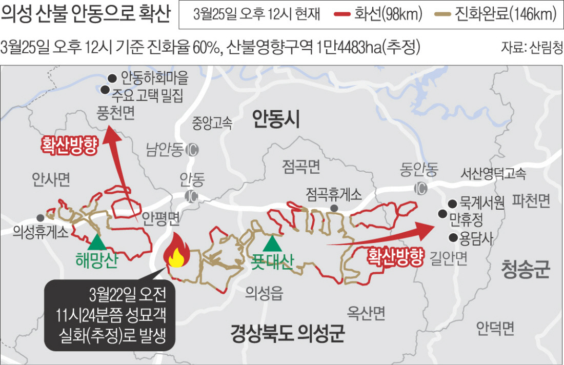 최근 경북 의성에서 시작된 산불이 빠르게 확산되고 있어. 이 불은 강한 바람을 타고 안동까지 번져가고 있는데, 현재 진화율은 60% 정도라고 해. 불이 시작된 지 얼마 되지 않아, 이미 많은 지역이 피해를 입었고, 특히 하회마을과 병산서원이 큰 위협을 받고 있어.