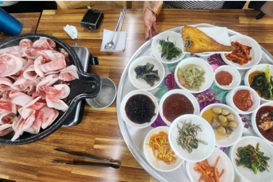 주문한 삼겹살 백반이 나왔을 때, 그 향과 비주얼이 대박이었어! 고소하고 기름진 삼겹살이 숯불에서 구워져 나오고, 그 옆에는 다양한 반찬들이 함께 나왔지. 반찬들도 푸짐하게 나와서 정말 만족스러웠어.